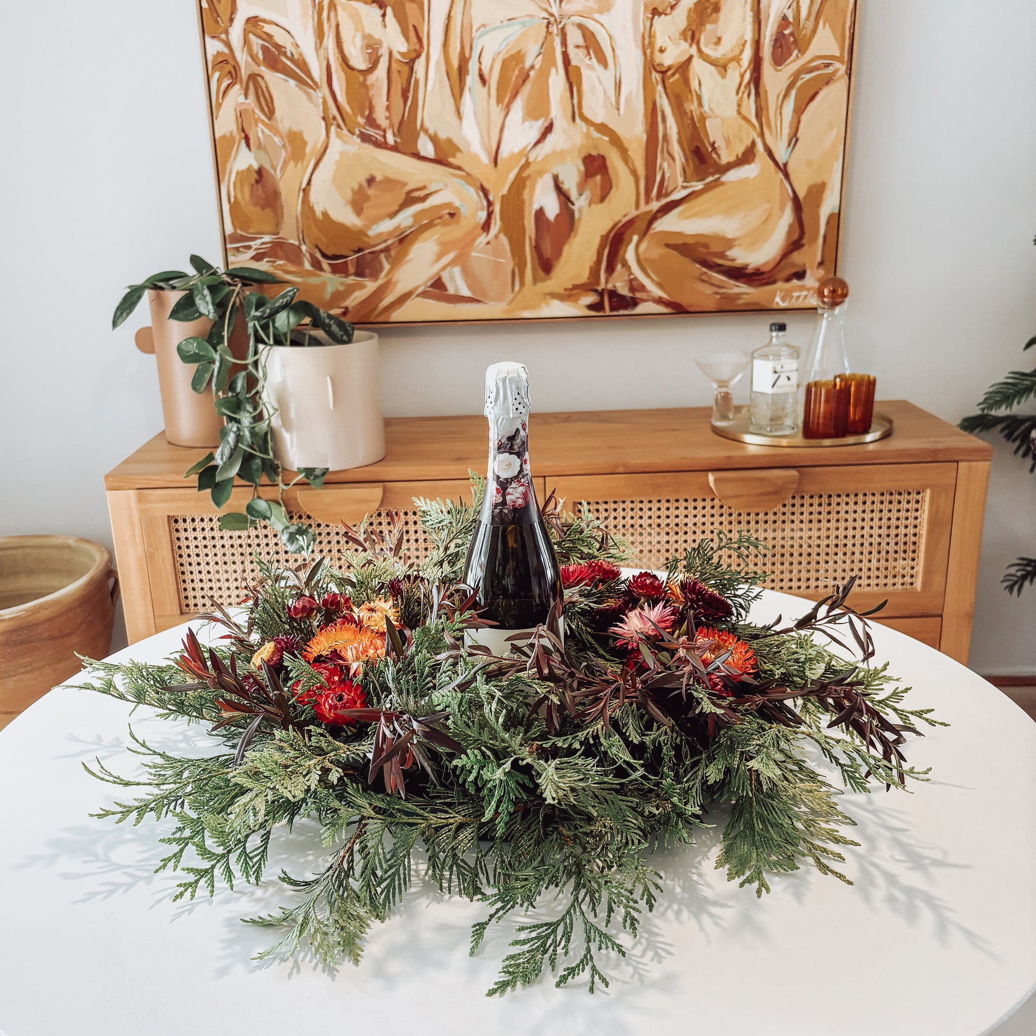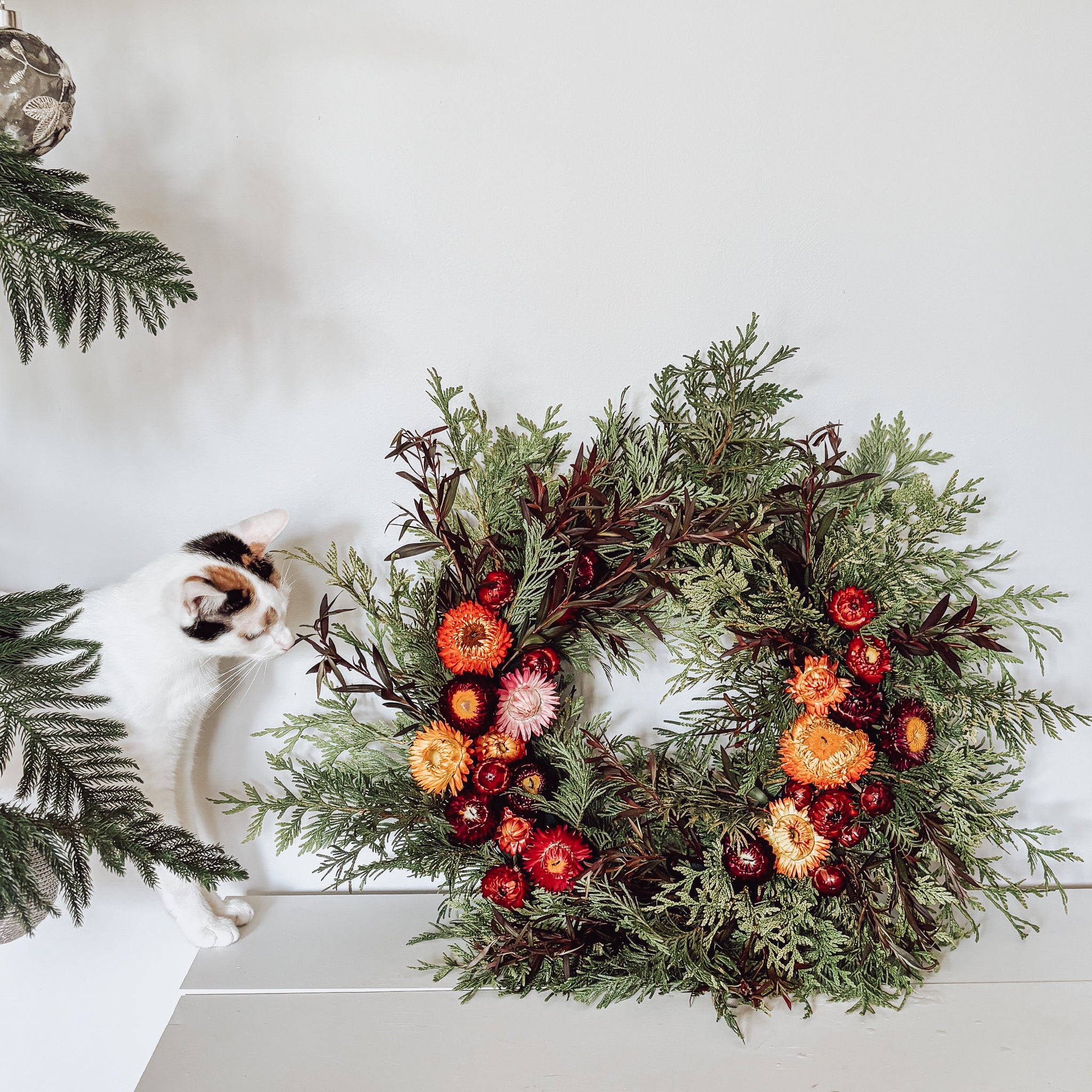 a fresh mix of Christmas themed blooms arranged in a floral foam wreath. Simply top up foam with fresh water every few days.