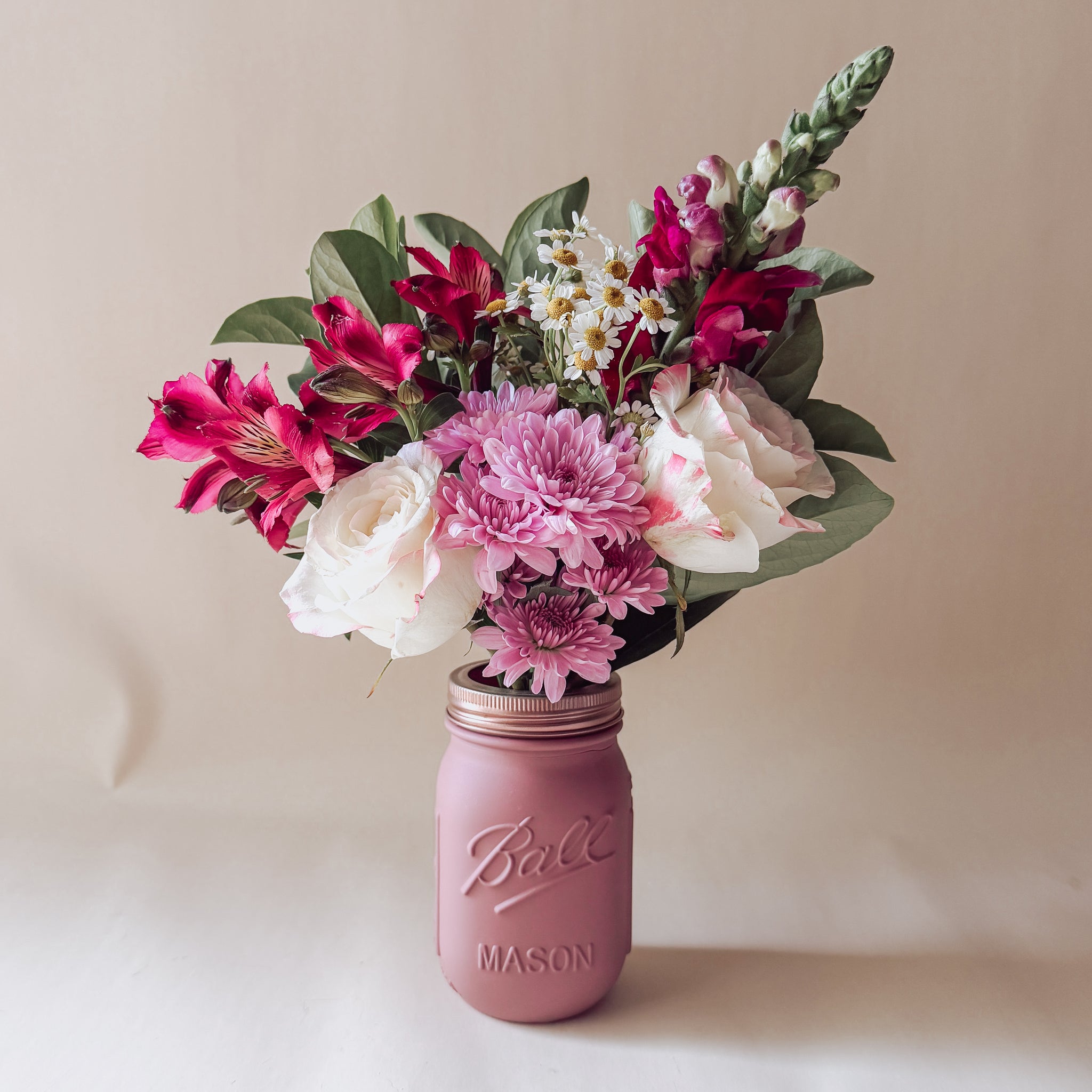 'this weeks blooms' in an artisan painted mason jar featuring our pink clay colourway with a matte finish and rose coloured lid