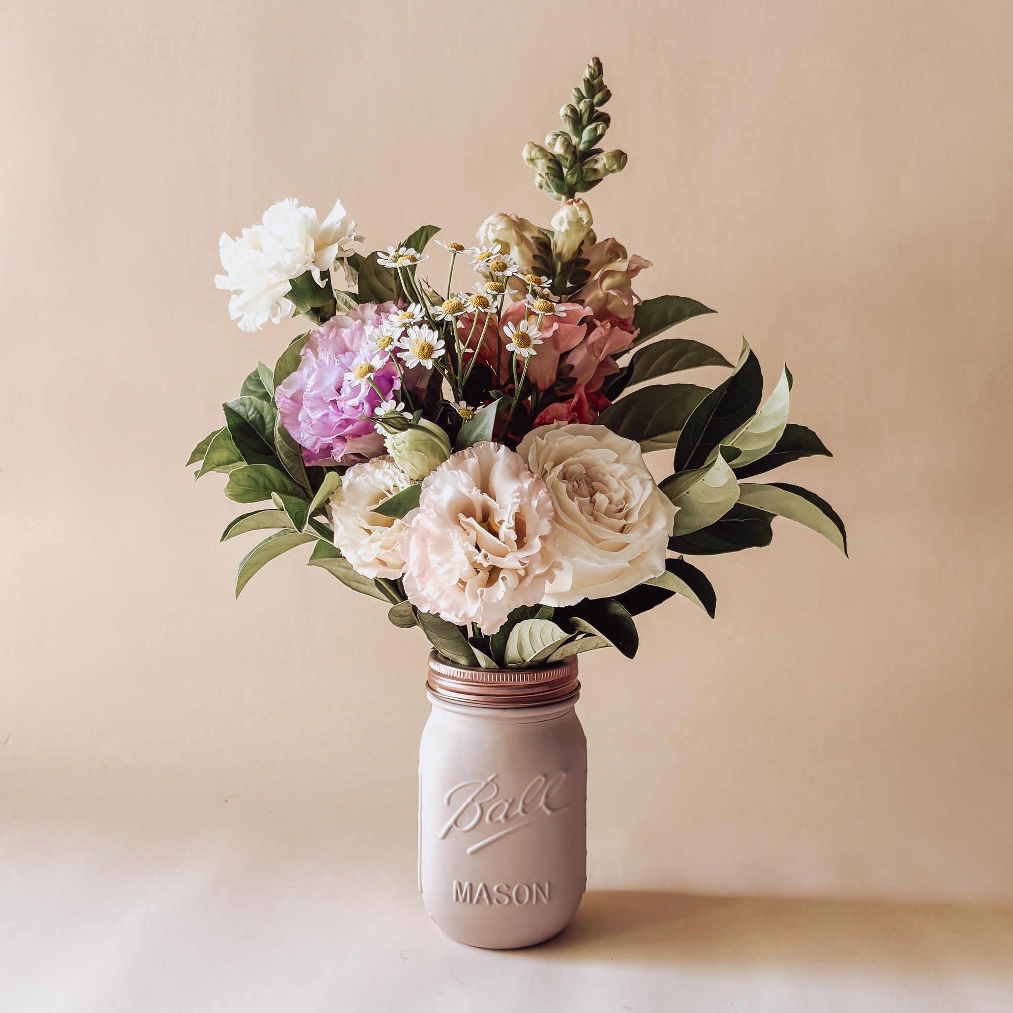 "this weeks fresh blooms" in an artisan painted mason jar featuring our fawn colourway with a matte finish and rose` coloured lid
